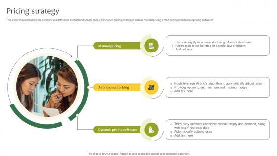 This slide showcases how the company will determine product and service prices. It includes pricing strategies such as manual pricing, smart pricing and dynamic pricing softwares. Do you have an important presentation coming up Are you looking for something that will make your presentation stand out from the rest Look no further than Pricing Strategy Lodging And Breakfast Business Model BMC SS V. With our professional designs, you can trust that your presentation will pop and make delivering it a smooth process. And with Slidegeeks, you can trust that your presentation will be unique and memorable. So why wait Grab Pricing Strategy Lodging And Breakfast Business Model BMC SS V today and make your presentation stand out from the rest This slide showcases how the company will determine product and service prices. It includes pricing strategies such as manual pricing, smart pricing and dynamic pricing softwares.