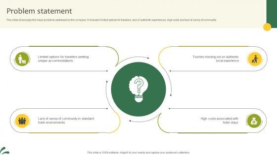 This slide showcases the major problems addressed by the company. It includes limited options for travelers, lack of authentic experiences, high costs and lack of sense of community. Whether you have daily or monthly meetings, a brilliant presentation is necessary. Problem Statement Lodging And Breakfast Business Model BMC SS V can be your best option for delivering a presentation. Represent everything in detail using Problem Statement Lodging And Breakfast Business Model BMC SS V and make yourself stand out in meetings. The template is versatile and follows a structure that will cater to your requirements. All the templates prepared by Slidegeeks are easy to download and edit. Our research experts have taken care of the corporate themes as well. So, give it a try and see the results. This slide showcases the major problems addressed by the company. It includes limited options for travelers, lack of authentic experiences, high costs and lack of sense of community.
