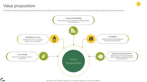 This slide showcases the unique selling proposition offered by the company to its customers. It includes cost savings, flexibility to hosts, community building, scalability and unique travel experiences. Are you in need of a template that can accommodate all of your creative concepts This one is crafted professionally and can be altered to fit any style. Use it with Google Slides or PowerPoint. Include striking photographs, symbols, depictions, and other visuals. Fill, move around, or remove text boxes as desired. Test out color palettes and font mixtures. Edit and save your work, or work with colleagues. Download Value Proposition Lodging And Breakfast Business Model BMC SS V and observe how to make your presentation outstanding. Give an impeccable presentation to your group and make your presentation unforgettable. This slide showcases the unique selling proposition offered by the company to its customers. It includes cost savings, flexibility to hosts, community building, scalability and unique travel experiences.
