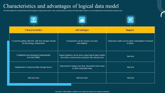 This slide explains the characteristics and advantages of a logical data model. It also contains impacts caused by the data models features, such as independent of physical data storage devices. If you are looking for a format to display your unique thoughts, then the professionally designed Database Modeling Structures Characteristics And Advantages Of Logical Data Model Topics Pdf is the one for you. You can use it as a Google Slides template or a PowerPoint template. Incorporate impressive visuals, symbols, images, and other charts. Modify or reorganize the text boxes as you desire. Experiment with shade schemes and font pairings. Alter, share or cooperate with other people on your work. Download Database Modeling Structures Characteristics And Advantages Of Logical Data Model Topics Pdf and find out how to give a successful presentation. Present a perfect display to your team and make your presentation unforgettable. This slide explains the characteristics and advantages of a logical data model. It also contains impacts caused by the data models features, such as independent of physical data storage devices.