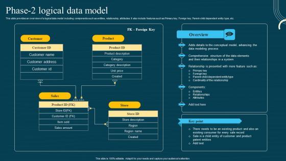 This slide provides an overview of a logical data model including components such as entities, relationship, attributes. It also include features such as primary key, foreign key, parent child dependent entity type, etc. Welcome to our selection of the Phase 2 Logical Data Model Data Modeling Approaches For Modern Analytics Elements Pdf. These are designed to help you showcase your creativity and bring your sphere to life. Planning and Innovation are essential for any business that is just starting out. This collection contains the designs that you need for your everyday presentations. All of our PowerPoints are 100 percent editable, so you can customize them to suit your needs. This multi purpose template can be used in various situations. Grab these presentation templates today This slide provides an overview of a logical data model including components such as entities, relationship, attributes. It also include features such as primary key, foreign key, parent child dependent entity type, etc.
