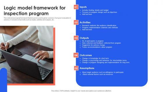 This slide shows logical framework that should be used to get an overview of program evaluation in advance. It include components such as inputs, activities and outputs,,etc..Showcasing this set of slides titled Logic Model Framework For Inspection Program Slides Pdf The topics addressed in these templates are Program Implementation, Future Recommendations, Such Resources All the content presented in this PPT design is completely editable. Download it and make adjustments in color, background, font etc. as per your unique business setting. This slide shows logical framework that should be used to get an overview of program evaluation in advance. It include components such as inputs, activities and outputs,,etc..