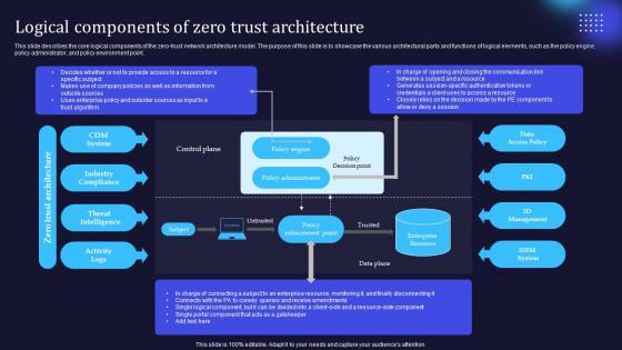 This slide describes the core logical components of the zero-trust network architecture model. The purpose of this slide is to showcase the various architectural parts and functions of logical elements, such as the policy engine, policy administrator, and policy environment point. The best PPT templates are a great way to save time, energy, and resources. Slidegeeks have 100 percent editable powerpoint slides making them incredibly versatile. With these quality presentation templates, you can create a captivating and memorable presentation by combining visually appealing slides and effectively communicating your message. Download Zero Trust Model Logical Components Of Zero Trust Architecture from Slidegeeks and deliver a wonderful presentation. This slide describes the core logical components of the zero-trust network architecture model. The purpose of this slide is to showcase the various architectural parts and functions of logical elements, such as the policy engine, policy administrator, and policy environment point.