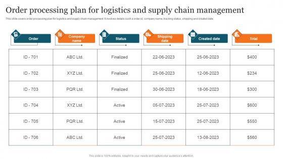 This slide covers order processing plan for logistics and supply chain management. It involves details such a order id, company name, tracking status, shipping and created date. This Order Processing Plan Logistics Advanced Supply Chain Improvement Strategies Mockup Pdf is perfect for any presentation, be it in front of clients or colleagues. It is a versatile and stylish solution for organizing your meetings. The Order Processing Plan Logistics Advanced Supply Chain Improvement Strategies Mockup Pdf features a modern design for your presentation meetings. The adjustable and customizable slides provide unlimited possibilities for acing up your presentation. Slidegeeks has done all the homework before launching the product for you. So, do not wait, grab the presentation templates today This slide covers order processing plan for logistics and supply chain management. It involves details such a order id, company name, tracking status, shipping and created date.
