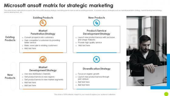 This slide shows matrix which is used by the microsoft to develop strategic marketing plan for new as well as existing products . It includes various strategies such as market penetration strategy, market development strategy, service development, etc. Retrieve professionally designed Microsoft Ansoff Matrix For Strategic Marketing Microsoft Long Term Business Guidelines PDF to effectively convey your message and captivate your listeners. Save time by selecting pre-made slideshows that are appropriate for various topics, from business to educational purposes. These themes come in many different styles, from creative to corporate, and all of them are easily adjustable and can be edited quickly. Access them as PowerPoint templates or as Google Slides themes. You do not have to go on a hunt for the perfect presentation because Slidegeeks got you covered from everywhere. This slide shows matrix which is used by the microsoft to develop strategic marketing plan for new as well as existing products . It includes various strategies such as market penetration strategy, market development strategy, service development, etc.