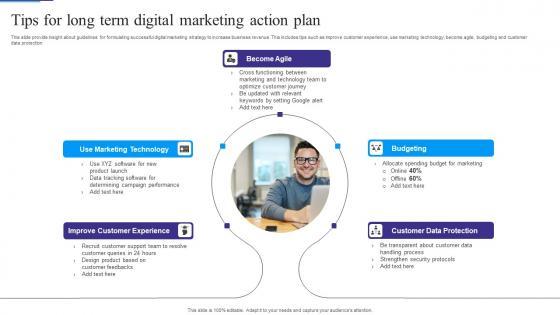 This slide provide insight about guidelines for formulating successful digital marketing strategy to increase business revenue. This includes tips such as improve customer experience, use marketing technology, become agile, budgeting and customer data protection. Pitch your topic with ease and precision using this Tips For Long Term Digital Marketing Action Plan Slides Pdf. This layout presents information on Budgeting, Customer Data Protection, Use Marketing Technology, Improve Customer Experience. It is also available for immediate download and adjustment. So, changes can be made in the color, design, graphics or any other component to create a unique layout. This slide provide insight about guidelines for formulating successful digital marketing strategy to increase business revenue. This includes tips such as improve customer experience, use marketing technology, become agile, budgeting and customer data protection.