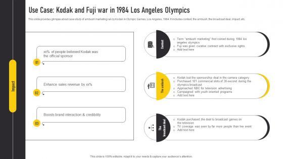 This slide provides glimpse about case study of ambush marketing ran by Kodak in Olympic Games, Los Angeles, 1984. It includes context, the ambush, the broadcast deal, impact, etc. Present like a pro with Use Case Kodak And Fuji War In 1984 Los Angeles Automate Guerrilla Promotional Information Pdf Create beautiful presentations together with your team, using our easy-to-use presentation slides. Share your ideas in real-time and make changes on the fly by downloading our templates. So whether you are in the office, on the go, or in a remote location, you can stay in sync with your team and present your ideas with confidence. With Slidegeeks presentation got a whole lot easier. Grab these presentations today. This slide provides glimpse about case study of ambush marketing ran by Kodak in Olympic Games, Los Angeles, 1984. It includes context, the ambush, the broadcast deal, impact, etc.