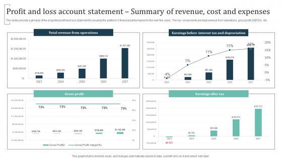 The slides provide a glimpse of the projected profit and loss statement to visualize the platforms financial performance for the next five years. The key components are total revenue from operations, gross profit, EBITDA, etc. Do you have to make sure that everyone on your team knows about any specific topic I yes, then you should give Profit And Loss Account Statement Summary Of Revenue Cost And Expenses Portrait PDF a try. Our experts have put a lot of knowledge and effort into creating this impeccable Profit And Loss Account Statement Summary Of Revenue Cost And Expenses Portrait PDF. You can use this template for your upcoming presentations, as the slides are perfect to represent even the tiniest detail. You can download these templates from the Slidegeeks website and these are easy to edit. So grab these today.