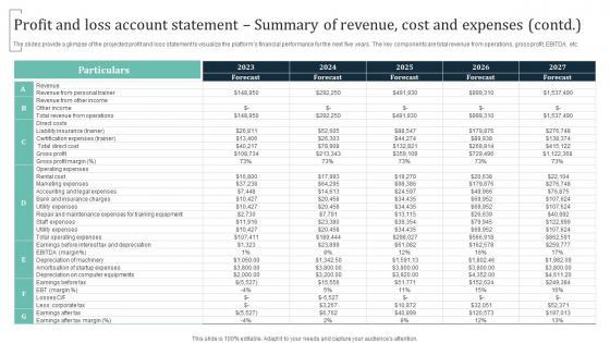The slides provide a glimpse of the projected profit and loss statement to visualize the platforms financial performance for the next five years. The key components are total revenue from operations, gross profit, EBITDA, etc. There are so many reasons you need a Profit And Loss Account Statement Summary Of Revenue Group Training Business Rules Pdf The first reason is you can not spend time making everything from scratch, Thus, Slidegeeks has made presentation templates for you too. You can easily download these templates from our website easily. The slides provide a glimpse of the projected profit and loss statement to visualize the platforms financial performance for the next five years. The key components are total revenue from operations, gross profit, EBITDA, etc.