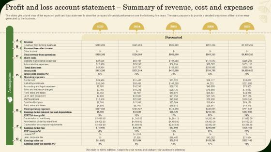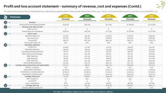 The slides give a brief view of the expected profit and loss statement to show the companys financial performance over the following five years. The main purpose is to provide a detailed breakdown of the total revenue generated by the business. Slidegeeks has constructed Profit And Loss Account Statement Summary Of Revenue Landscaping Business Plan Ppt Template BP SS V after conducting extensive research and examination. These presentation templates are constantly being generated and modified based on user preferences and critiques from editors. Here, you will find the most attractive templates for a range of purposes while taking into account ratings and remarks from users regarding the content. This is an excellent jumping-off point to explore our content and will give new users an insight into our top-notch PowerPoint Templates. The slides give a brief view of the expected profit and loss statement to show the companys financial performance over the following five years. The main purpose is to provide a detailed breakdown of the total revenue generated by the business.