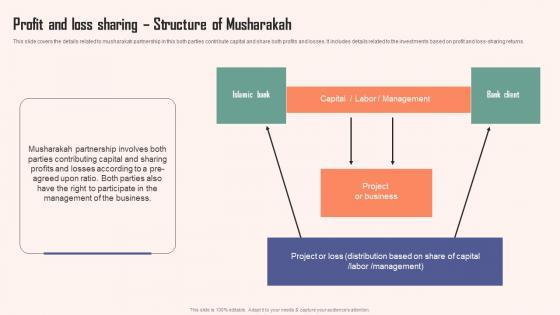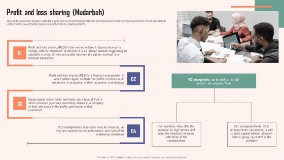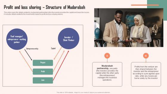 This slide covers the details related to mudarabah partnership in this the investor provides the capital and bears the losses. It includes details related to the investments based on profit and loss-sharing returns. If your project calls for a presentation, then Slidegeeks is your go-to partner because we have professionally designed, easy-to-edit templates that are perfect for any presentation. After downloading, you can easily edit Profit And Loss Sharing Structure Of Mudarabah Comprehensive Guide Islamic Portrait PDF and make the changes accordingly. You can rearrange slides or fill them with different images. Check out all the handy templates This slide covers the details related to mudarabah partnership in this the investor provides the capital and bears the losses. It includes details related to the investments based on profit and loss-sharing returns.