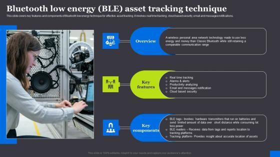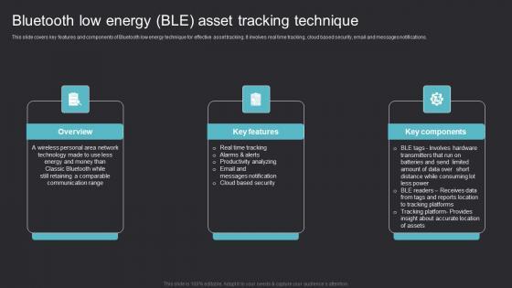 This slide covers key features and components of Bluetooth low energy technique for effective asset tracking. It involves real time tracking, cloud based security, email and messages notifications. From laying roadmaps to briefing everything in detail, our templates are perfect for you. You can set the stage with your presentation slides. All you have to do is download these easy to edit and customizable templates. Bluetooth Low Energy Ble Maximizing Efficiency With Asset Tracking Solutions Formats Pdf will help you deliver an outstanding performance that everyone would remember and praise you for. Do download this presentation today. This slide covers key features and components of Bluetooth low energy technique for effective asset tracking. It involves real time tracking, cloud based security, email and messages notifications.