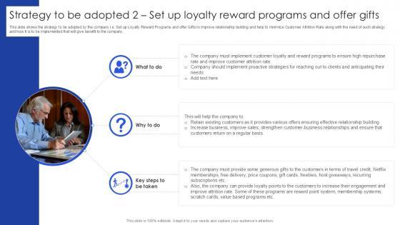 This slide shows the strategy to be adopted by the company i.e. Set up Loyalty Reward Programs and offer Gifts to improve relationship building and help to minimize Customer Attrition Rate along with the need of such strategy and how it is to be implemented that will give benefit to the company. Explore a selection of the finest Strategy To Be Adopted 2 Set Up Loyalty Reward Programs And Offer Gifts PPT PowerPoint SS here. With a plethora of professionally designed and pre-made slide templates, you can quickly and easily find the right one for your upcoming presentation. You can use our Strategy To Be Adopted 2 Set Up Loyalty Reward Programs And Offer Gifts PPT PowerPoint SS to effectively convey your message to a wider audience. Slidegeeks has done a lot of research before preparing these presentation templates. The content can be personalized and the slides are highly editable. Grab templates today from Slidegeeks. This slide shows the strategy to be adopted by the company i.e. Set up Loyalty Reward Programs and offer Gifts to improve relationship building and help to minimize Customer Attrition Rate along with the need of such strategy and how it is to be implemented that will give benefit to the company.