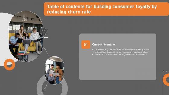 Boost your pitch with our creative Building Consumer Loyalty By Reducing Churn Rate Table Of Contents Slides PDF. Deliver an awe inspiring pitch that will mesmerize everyone. Using these presentation templates you will surely catch everyones attention. You can browse the ppts collection on our website. We have researchers who are experts at creating the right content for the templates. So you do not have to invest time in any additional work. Just grab the template now and use them.