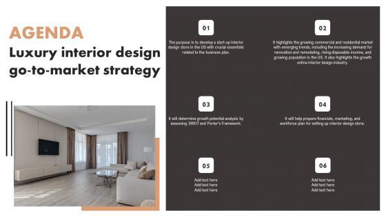 Crafting an eye-catching presentation has never been more straightforward. Let your presentation shine with this tasteful yet straightforward Agenda Luxury Interior Design Go To Market Strategy Diagrams Pdf template. It offers a minimalistic and classy look that is great for making a statement. The colors have been employed intelligently to add a bit of playfulness while still remaining professional. Construct the ideal Agenda Luxury Interior Design Go To Market Strategy Diagrams Pdf that effortlessly grabs the attention of your audience. Begin now and be certain to wow your customers. Our Agenda Luxury Interior Design Go To Market Strategy Diagrams Pdf are topically designed to provide an attractive backdrop to any subject. Use them to look like a presentation pro.