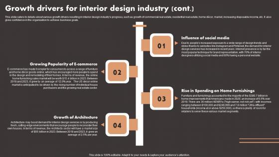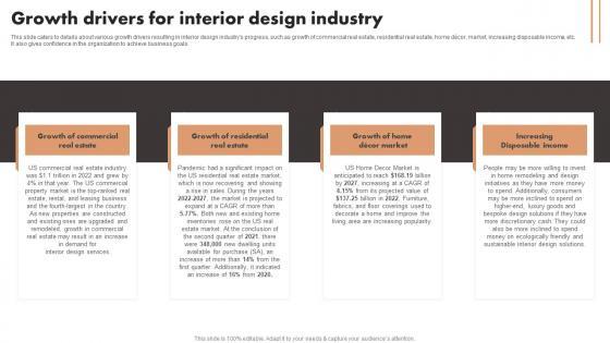 This slide caters to details about various growth drivers resulting in interior design industrys progress, such as growth of commercial real estate, residential real estate, home decor, market, increasing disposable income, etc. It also gives confidence in the organization to achieve business goals. Here you can discover an assortment of the finest PowerPoint and Google Slides templates. With these templates, you can create presentations for a variety of purposes while simultaneously providing your audience with an eye-catching visual experience. Download Growth Drivers For Interior Design Industry Luxury Interior Design Pictures Pdf to deliver an impeccable presentation. These templates will make your job of preparing presentations much quicker, yet still, maintain a high level of quality. Slidegeeks has experienced researchers who prepare these templates and write high-quality content for you. Later on, you can personalize the content by editing the Growth Drivers For Interior Design Industry Luxury Interior Design Pictures Pdf This slide caters to details about various growth drivers resulting in interior design industrys progress, such as growth of commercial real estate, residential real estate, home decor, market, increasing disposable income, etc. It also gives confidence in the organization to achieve business goals.