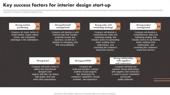 This slide covers the essential points to be considered while operating an interior design business in the market. These are understanding prospects needs, focusing on outcomes and emotions, and building a solid brand that is required for a company to compete in its target markets. Slidegeeks is one of the best resources for PowerPoint templates. You can download easily and regulate Key Success Factors For Interior Design Start Up Luxury Interior Design Themes Pdf for your personal presentations from our wonderful collection. A few clicks is all it takes to discover and get the most relevant and appropriate templates. Use our Templates to add a unique zing and appeal to your presentation and meetings. All the slides are easy to edit and you can use them even for advertisement purposes. This slide covers the essential points to be considered while operating an interior design business in the market. These are understanding prospects needs, focusing on outcomes and emotions, and building a solid brand that is required for a company to compete in its target markets.
