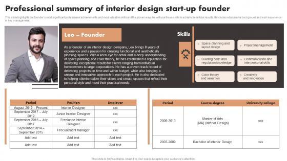 This slide highlights the founders most significant professional achievements and most valuable skills and the proven ways he will use those skills to achieve beneficial results. It includes educational background and work experience in key management. From laying roadmaps to briefing everything in detail, our templates are perfect for you. You can set the stage with your presentation slides. All you have to do is download these easy-to-edit and customizable templates. Professional Summary Of Interior Design Start Up Founder Luxury Interior Design Background Pdf will help you deliver an outstanding performance that everyone would remember and praise you for. Do download this presentation today. This slide highlights the founders most significant professional achievements and most valuable skills and the proven ways he will use those skills to achieve beneficial results. It includes educational background and work experience in key management.