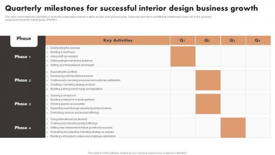 The slide covers particular objectives or goals the organization intends to attain as part of its business plan. These are short-term quantifiable milestones to check off as the company progresses toward its overall goals of the firm. Slidegeeks is here to make your presentations a breeze with Quarterly Milestones For Successful Interior Design Business Growth Luxury Interior Design Summary Pdf With our easy-to-use and customizable templates, you can focus on delivering your ideas rather than worrying about formatting. With a variety of designs to choose from, you are sure to find one that suits your needs. And with animations and unique photos, illustrations, and fonts, you can make your presentation pop. So whether you are giving a sales pitch or presenting to the board, make sure to check out Slidegeeks first. The slide covers particular objectives or goals the organization intends to attain as part of its business plan. These are short-term quantifiable milestones to check off as the company progresses toward its overall goals of the firm.