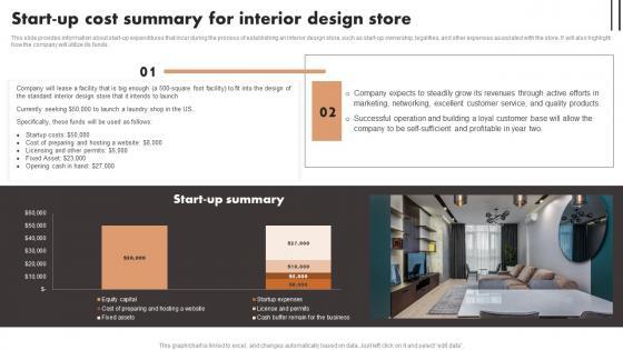 This slide provides information about start-up expenditures that incur during the process of establishing an interior design store, such as start-up ownership, legalities, and other expenses associated with the store. It will also highlight how the company will utilize its funds. Whether you have daily or monthly meetings, a brilliant presentation is necessary. Start Up Cost Summary For Interior Design Store Luxury Interior Design Graphics Pdf can be your best option for delivering a presentation. Represent everything in detail using Start Up Cost Summary For Interior Design Store Luxury Interior Design Graphics Pdf and make yourself stand out in meetings. The template is versatile and follows a structure that will cater to your requirements. All the templates prepared by Slidegeeks are easy to download and edit. Our research experts have taken care of the corporate themes as well. So, give it a try and see the results. This slide provides information about start-up expenditures that incur during the process of establishing an interior design store, such as start-up ownership, legalities, and other expenses associated with the store. It will also highlight how the company will utilize its funds.