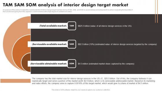 he purpose of this slide is to depict the market potential of interior design target market in terms of TAM, SAM, and SOM to assist startups and enterprise firms alike in evaluating the feasibility of their product and giving them the capacity to solicit investors with a high degree of confidence in return. Find highly impressive Tam Sam Som Analysis Of Interior Design Target Market Luxury Interior Design Portrait Pdf on Slidegeeks to deliver a meaningful presentation. You can save an ample amount of time using these presentation templates. No need to worry to prepare everything from scratch because Slidegeeks experts have already done a huge research and work for you. You need to download Tam Sam Som Analysis Of Interior Design Target Market Luxury Interior Design Portrait Pdf for your upcoming presentation. All the presentation templates are 100 percent editable and you can change the color and personalize the content accordingly. Download now. he purpose of this slide is to depict the market potential of interior design target market in terms of TAM, SAM, and SOM to assist startups and enterprise firms alike in evaluating the feasibility of their product and giving them the capacity to solicit investors with a high degree of confidence in return.