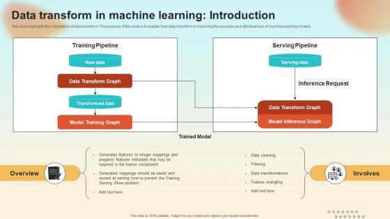 This slide highlights the importance of data transform. The purpose of this slide is to explain how data transform is improving the accuracy and effectiveness of machine learning models. Coming up with a presentation necessitates that the majority of the effort goes into the content and the message you intend to convey. The visuals of a PowerPoint presentation can only be effective if it supplements and supports the story that is being told. Keeping this in mind our experts created Data Transform In Machine Learning Introduction Introduction To MLOPs IT to reduce the time that goes into designing the presentation. This way, you can concentrate on the message while our designers take care of providing you with the right template for the situation. This slide highlights the importance of data transform. The purpose of this slide is to explain how data transform is improving the accuracy and effectiveness of machine learning models.