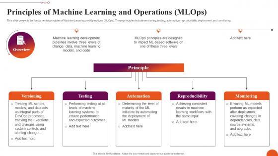 This slide presents the fundamental principles of Machine Learning and Operations MLOps. These principles include versioning, testing, automation, reproducibility, deployment, and monitoring. From laying roadmaps to briefing everything in detail, our templates are perfect for you. You can set the stage with your presentation slides. All you have to do is download these easy-to-edit and customizable templates. Principles Of Machine Learning And Operations MLOPs Introduction To MLOPs IT will help you deliver an outstanding performance that everyone would remember and praise you for. Do download this presentation today. This slide presents the fundamental principles of Machine Learning and Operations MLOps. These principles include versioning, testing, automation, reproducibility, deployment, and monitoring.
