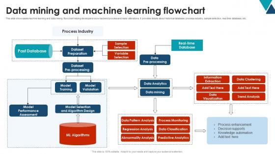This slide showcases machine learning and data mining flowchart helping developers know backend process and make alterations. It provides details about historical database, process industry, sample selection, real-time database, etc. Do you have an important presentation coming up Are you looking for something that will make your presentation stand out from the rest Look no further than Data Mining And Machine Learning Flowchart Using Data Mining Tools To Optimize Processes AI SS V. With our professional designs, you can trust that your presentation will pop and make delivering it a smooth process. And with Slidegeeks, you can trust that your presentation will be unique and memorable. So why wait Grab Data Mining And Machine Learning Flowchart Using Data Mining Tools To Optimize Processes AI SS V today and make your presentation stand out from the rest This slide showcases machine learning and data mining flowchart helping developers know backend process and make alterations. It provides details about historical database, process industry, sample selection, real-time database, etc.