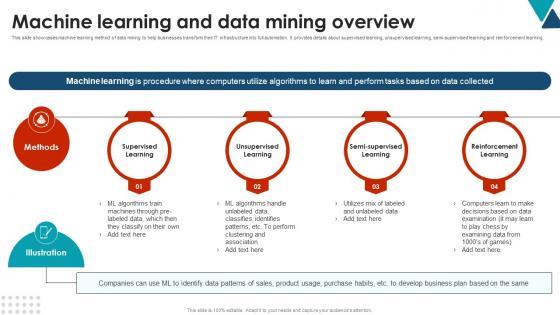This slide showcases machine learning method of data mining to help businesses transform their IT infrastructure into full automation. It provides details about supervised learning, unsupervised learning, semi-supervised learning and reinforcement learning. Are you searching for a Machine Learning And Data Mining Overview Using Data Mining Tools To Optimize Processes AI SS V that is uncluttered, straightforward, and original Its easy to edit, and you can change the colors to suit your personal or business branding. For a presentation that expresses how much effort you have put in, this template is ideal With all of its features, including tables, diagrams, statistics, and lists, its perfect for a business plan presentation. Make your ideas more appealing with these professional slides. Download Machine Learning And Data Mining Overview Using Data Mining Tools To Optimize Processes AI SS V from Slidegeeks today. This slide showcases machine learning method of data mining to help businesses transform their IT infrastructure into full automation. It provides details about supervised learning, unsupervised learning, semi-supervised learning and reinforcement learning.