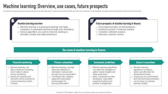 This slide showcases machine learning technology that can help organization to analyze the past financial data and make future predictions. It also highlights use cases and future prospects of machine learning technology. From laying roadmaps to briefing everything in detail, our templates are perfect for you. You can set the stage with your presentation slides. All you have to do is download these easy-to-edit and customizable templates. Machine Learning Overview Use Cases Future Prospects Slides Pdf will help you deliver an outstanding performance that everyone would remember and praise you for. Do download this presentation today. This slide showcases machine learning technology that can help organization to analyze the past financial data and make future predictions. It also highlights use cases and future prospects of machine learning technology.