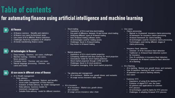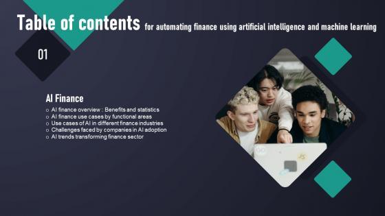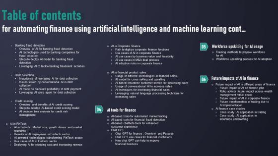 This Table Of Contents Automating Finance Using Artificial Intelligence And Machine Learning Infographics Pdf is perfect for any presentation, be it in front of clients or colleagues. It is a versatile and stylish solution for organizing your meetings. The Automating Finance Using Artificial Intelligence And Machine Learning Table Of Contents Infographics Pdf features a modern design for your presentation meetings. The adjustable and customizable slides provide unlimited possibilities for acing up your presentation. Slidegeeks has done all the homework before launching the product for you. So, do not wait, grab the presentation templates today Our Table Of Contents Automating Finance Using Artificial Intelligence And Machine Learning Infographics Pdf are topically designed to provide an attractive backdrop to any subject. Use them to look like a presentation pro.