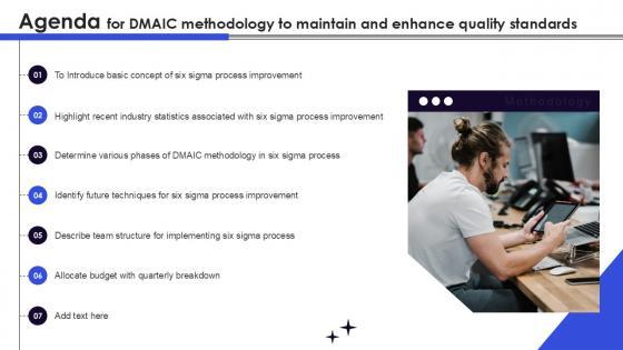 Find a pre-designed and impeccable Agenda For DMAIC Methodology To Maintain And Enhance Quality PPT Example. The templates can ace your presentation without additional effort. You can download these easy-to-edit presentation templates to make your presentation stand out from others. So, what are you waiting for Download the template from Slidegeeks today and give a unique touch to your presentation. Our Agenda For DMAIC Methodology To Maintain And Enhance Quality PPT Example are topically designed to provide an attractive backdrop to any subject. Use them to look like a presentation pro.