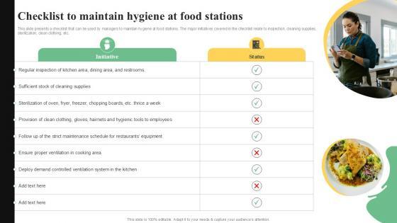 This slide presents a checklist that can be used by managers to maintain hygiene at food stations. The major initiatives covered in the checklist relate to inspection, cleaning supplies, sterilization, clean clothing, etc. Present like a pro with Checklist To Maintain Hygiene At Quality Control Guide For Food PPT Example. Create beautiful presentations together with your team, using our easy-to-use presentation slides. Share your ideas in real-time and make changes on the fly by downloading our templates. So whether you are in the office, on the go, or in a remote location, you can stay in sync with your team and present your ideas with confidence. With Slidegeeks presentation got a whole lot easier. Grab these presentations today. This slide presents a checklist that can be used by managers to maintain hygiene at food stations. The major initiatives covered in the checklist relate to inspection, cleaning supplies, sterilization, clean clothing, etc.