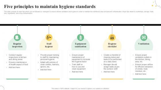This slide consists of major tips which can be followed by managers to ensure kitchen sanitation and hygiene in order to maintain the nutritional value and prevent contamination. Major tips relate to countertops, storage, trash, bins, ingredients, and cross-contamination. If your project calls for a presentation, then Slidegeeks is your go-to partner because we have professionally designed, easy-to-edit templates that are perfect for any presentation. After downloading, you can easily edit Five Principles To Maintain Hygiene Quality Control Guide For Food PPT Example and make the changes accordingly. You can rearrange slides or fill them with different images. Check out all the handy templates This slide consists of major tips which can be followed by managers to ensure kitchen sanitation and hygiene in order to maintain the nutritional value and prevent contamination. Major tips relate to countertops, storage, trash, bins, ingredients, and cross-contamination.