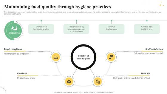 This slide gives an overview of maintaining food quality through hygiene practices in order to prevent contamination and ensure that food remains safe for consumption. Major elements covered in the slide and the objectives and benefits of food hygiene. The Maintaining Food Quality Through Quality Control Guide For Food PPT Slide is a compilation of the most recent design trends as a series of slides. It is suitable for any subject or industry presentation, containing attractive visuals and photo spots for businesses to clearly express their messages. This template contains a variety of slides for the user to input data, such as structures to contrast two elements, bullet points, and slides for written information. Slidegeeks is prepared to create an impression. This slide gives an overview of maintaining food quality through hygiene practices in order to prevent contamination and ensure that food remains safe for consumption. Major elements covered in the slide and the objectives and benefits of food hygiene.