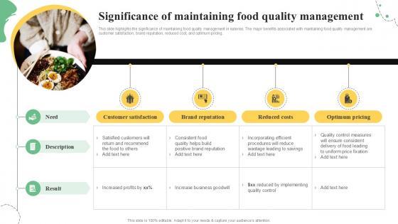 This slide highlights the significance of maintaining food quality management in eateries. The major benefits associated with maintaining food quality management are customer satisfaction, brand reputation, reduced cost, and optimum pricing. From laying roadmaps to briefing everything in detail, our templates are perfect for you. You can set the stage with your presentation slides. All you have to do is download these easy-to-edit and customizable templates. Significance Of Maintaining Quality Control Guide For Food PPT Template will help you deliver an outstanding performance that everyone would remember and praise you for. Do download this presentation today. This slide highlights the significance of maintaining food quality management in eateries. The major benefits associated with maintaining food quality management are customer satisfaction, brand reputation, reduced cost, and optimum pricing.
