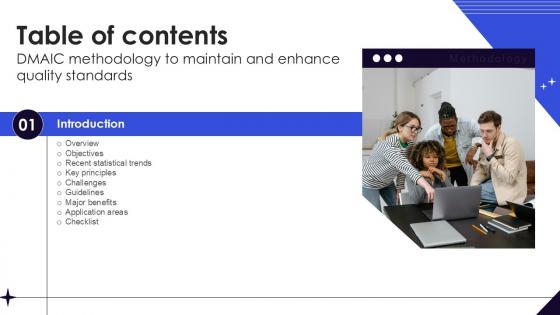 Take your projects to the next level with our ultimate collection of Table Of Contents For DMAIC Methodology To Maintain And Enhance Quality PPT Template. Slidegeeks has designed a range of layouts that are perfect for representing task or activity duration, keeping track of all your deadlines at a glance. Tailor these designs to your exact needs and give them a truly corporate look with your own brand colors they will make your projects stand out from the rest Our Table Of Contents For DMAIC Methodology To Maintain And Enhance Quality PPT Template are topically designed to provide an attractive backdrop to any subject. Use them to look like a presentation pro.