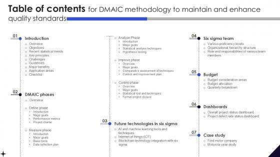 Do you know about Slidesgeeks Table Of Contents DMAIC Methodology To Maintain And Enhance Quality PPT Example These are perfect for delivering any kind od presentation. Using it, create PowerPoint presentations that communicate your ideas and engage audiences. Save time and effort by using our pre-designed presentation templates that are perfect for a wide range of topic. Our vast selection of designs covers a range of styles, from creative to business, and are all highly customizable and easy to edit. Download as a PowerPoint template or use them as Google Slides themes. Our Table Of Contents DMAIC Methodology To Maintain And Enhance Quality PPT Example are topically designed to provide an attractive backdrop to any subject. Use them to look like a presentation pro.