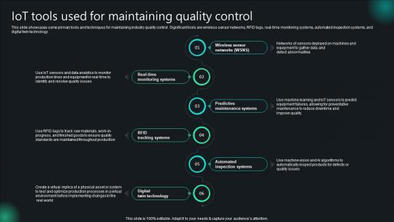 This slide showcases some primary tools and techniques for maintaining industry quality control. Significant tools are wireless sensor networks, RFID tags, real-time monitoring systems, automated inspection systems, and digital twin technology. Take your projects to the next level with our ultimate collection of Unlocking Potential IoTs Application IoT Tools Used For Maintaining Quality Control IoT SS V. Slidegeeks has designed a range of layouts that are perfect for representing task or activity duration, keeping track of all your deadlines at a glance. Tailor these designs to your exact needs and give them a truly corporate look with your own brand colors they will make your projects stand out from the rest This slide showcases some primary tools and techniques for maintaining industry quality control. Significant tools are wireless sensor networks, RFID tags, real-time monitoring systems, automated inspection systems, and digital twin technology.