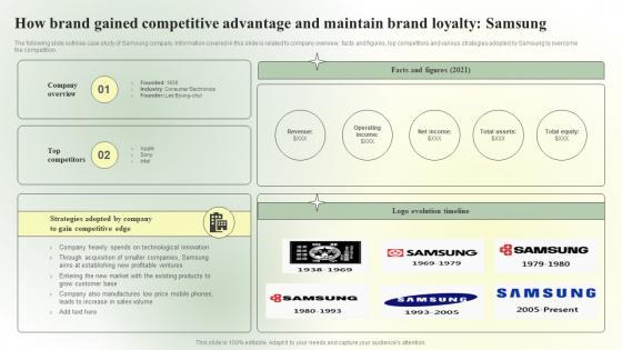 The following slide outlines case study of samsung company. Information covered in this slide is related to company overview, facts and figures, top competitors and various strategies adopted by samsung to overcome the competition. Here you can discover an assortment of the finest PowerPoint and Google Slides templates. With these templates, you can create presentations for a variety of purposes while simultaneously providing your audience with an eye catching visual experience. Download Brand Improvement Techniques To Build Consumer Loyalty How Brand Gained Competitive Advantage And Maintain Slides PDF to deliver an impeccable presentation. These templates will make your job of preparing presentations much quicker, yet still, maintain a high level of quality. Slidegeeks has experienced researchers who prepare these templates and write high quality content for you. Later on, you can personalize the content by editing the Brand Improvement Techniques To Build Consumer Loyalty How Brand Gained Competitive Advantage And Maintain Slides PDF.