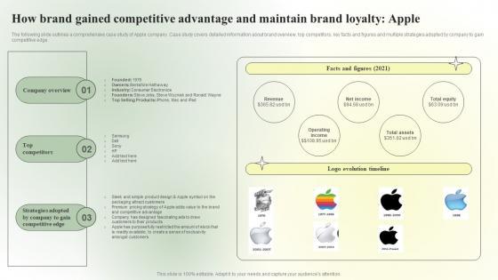 The following slide outlines a comprehensive case study of Apple company. Case study covers detailed information about brand overview, top competitors, key facts and figures and multiple strategies adopted by company to gain competitive edge. This Brand Improvement Techniques To Build Consumer Loyalty How Brand Gained Competitive Advantage Maintain Graphics PDF from Slidegeeks makes it easy to present information on your topic with precision. It provides customization options, so you can make changes to the colors, design, graphics, or any other component to create a unique layout. It is also available for immediate download, so you can begin using it right away. Slidegeeks has done good research to ensure that you have everything you need to make your presentation stand out. Make a name out there for a brilliant performance.