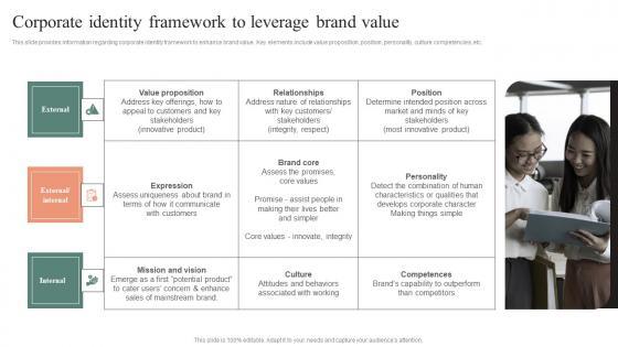 This slide provides information regarding corporate identity framework to enhance brand value. Key elements include value proposition, position, personality, culture competencies, etc. If your project calls for a presentation, then Slidegeeks is your go-to partner because we have professionally designed, easy-to-edit templates that are perfect for any presentation. After downloading, you can easily edit Corporate Identity Framework To Leverage Brand Value Effective Brand Maintenance Graphics Pdf and make the changes accordingly. You can rearrange slides or fill them with different images. Check out all the handy templates This slide provides information regarding corporate identity framework to enhance brand value. Key elements include value proposition, position, personality, culture competencies, etc.