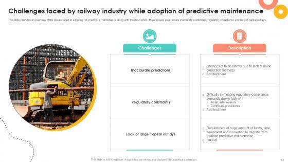 Use this Improving Passenger Experience By Implementing IoT Predictive Maintenance In Railways IoT CD V to ensure the business world gets to know you as a presentation expert with tremendous recall value. With its focus on providing the worlds best designs to highlight business ideas that have the potential to change the world, this PPT Template is sure to win you clients. The complete deck in sixty two slides is a compendium of information, structured in a manner that provides the best framework for a presentation. Use this completely editable and customizable presentation to make an impact and improve your order book. Download now. Our Improving Passenger Experience By Implementing IoT Predictive Maintenance In Railways IoT CD V are topically designed to provide an attractive backdrop to any subject. Use them to look like a presentation pro.