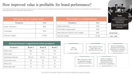 This slide provides information regarding comparison of well known brand and non popular brand based of overall price charged. It showcases comparative assessment of brand performance in terms of market share, brand score, etc. This modern and well-arranged How Improved Value Is Profitable For Brand Performance Effective Brand Maintenance Themes Pdf provides lots of creative possibilities. It is very simple to customize and edit with the Powerpoint Software. Just drag and drop your pictures into the shapes. All facets of this template can be edited with Powerpoint no extra software is necessary. Add your own material, put your images in the places assigned for them, adjust the colors, and then you can show your slides to the world, with an animated slide included. This slide provides information regarding comparison of well known brand and non popular brand based of overall price charged. It showcases comparative assessment of brand performance in terms of market share, brand score, etc.