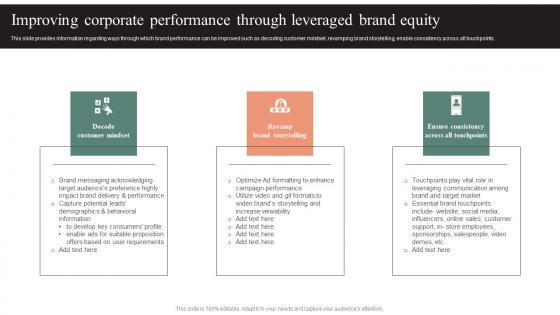 This slide provides information regarding ways through which brand performance can be improved such as decoding customer mindset, revamping brand storytelling, enable consistency across all touchpoints. Welcome to our selection of the Improving Corporate Performance Through Leveraged Effective Brand Maintenance Designs Pdf These are designed to help you showcase your creativity and bring your sphere to life. Planning and Innovation are essential for any business that is just starting out. This collection contains the designs that you need for your everyday presentations. All of our PowerPoints are 100 percent editable, so you can customize them to suit your needs. This multi-purpose template can be used in various situations. Grab these presentation templates today. This slide provides information regarding ways through which brand performance can be improved such as decoding customer mindset, revamping brand storytelling, enable consistency across all touchpoints.