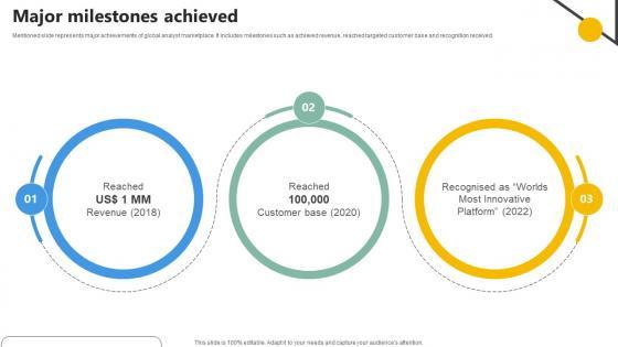 Mentioned slide represents major achievements of global analyst marketplace. It includes milestones such as achieved revenue, reached targeted customer base and recognition received.Do you have to make sure that everyone on your team knows about any specific topic I yes, then you should give Major Milestones Achieved Analytics Company Investor Funding Elevator a try. Our experts have put a lot of knowledge and effort into creating this impeccable Major Milestones Achieved Analytics Company Investor Funding Elevator. You can use this template for your upcoming presentations, as the slides are perfect to represent even the tiniest detail. You can download these templates from the Slidegeeks website and these are easy to edit. So grab these today Mentioned slide represents major achievements of global analyst marketplace. It includes milestones such as achieved revenue, reached targeted customer base and recognition received.