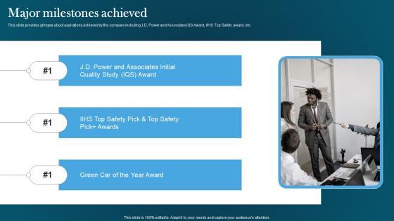 The following slide highlights major achievements accomplished by automobile company that focusses on vehicle production and maintenance so far. It comprises of all time brand for electrified vehicle sales, best brand for resale value, best overall truck brand, etc. If your project calls for a presentation, then Slidegeeks is your go-to partner because we have professionally designed, easy-to-edit templates that are perfect for any presentation. After downloading, you can easily edit Major Milestones Achieved Vehicle Company Capital Funding Pitch Deck and make the changes accordingly. You can rearrange slides or fill them with different images. Check out all the handy templates The following slide highlights major achievements accomplished by automobile company that focusses on vehicle production and maintenance so far. It comprises of all time brand for electrified vehicle sales, best brand for resale value, best overall truck brand, etc.