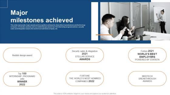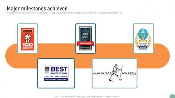 This slide provides an overview of the company achievements. It has received best places to work, people company that care, most innovative companies recognition and award. If your project calls for a presentation, then Slidegeeks is your go-to partner because we have professionally designed, easy-to-edit templates that are perfect for any presentation. After downloading, you can easily edit Major Milestones Achieved Software Development Company Funding Elevator Pitch Deck and make the changes accordingly. You can rearrange slides or fill them with different images. Check out all the handy templates This slide provides an overview of the company achievements. It has received best places to work, people company that care, most innovative companies recognition and award.
