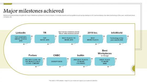 Mentioned slide provides insights into major milestones achieved by cloud company. It includes awards and recognitions such as top startups in US, best workplace, top-rated, technology of the year, world best cloud company, etc. If you are looking for a format to display your unique thoughts, then the professionally designed Major Milestones Achieved Cloud Data Computing Company Fund Raising Sample PDF is the one for you. You can use it as a Google Slides template or a PowerPoint template. Incorporate impressive visuals, symbols, images, and other charts. Modify or reorganize the text boxes as you desire. Experiment with shade schemes and font pairings. Alter, share or cooperate with other people on your work. Download Major Milestones Achieved Cloud Data Computing Company Fund Raising Sample PDF and find out how to give a successful presentation. Present a perfect display to your team and make your presentation unforgettable. Mentioned slide provides insights into major milestones achieved by cloud company. It includes awards and recognitions such as top startups in US, best workplace, top-rated, technology of the year, world best cloud company, etc.