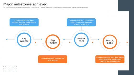 The following slide showcases various milestones that is achieved by an IT company that provides hybrid cloud-based data management software solutions to businesses. If you are looking for a format to display your unique thoughts, then the professionally designed Major Milestones Achieved Data Management Company Investor Funding Pitch Deck is the one for you. You can use it as a Google Slides template or a PowerPoint template. Incorporate impressive visuals, symbols, images, and other charts. Modify or reorganize the text boxes as you desire. Experiment with shade schemes and font pairings. Alter, share or cooperate with other people on your work. Download Major Milestones Achieved Data Management Company Investor Funding Pitch Deck and find out how to give a successful presentation. Present a perfect display to your team and make your presentation unforgettable. The following slide showcases various milestones that is achieved by an IT company that provides hybrid cloud-based data management software solutions to businesses.